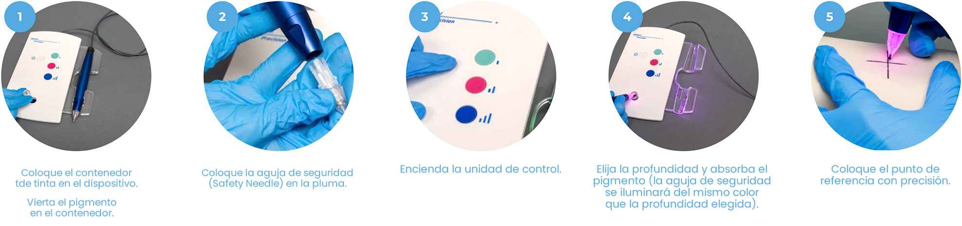 El dispositivo está cuidadosamente diseñado para aplicar marcas de referencia con inyección de profundidad controlada, lo que resulta en menos dolor para el paciente en comparación con otros métodos de marcado. Los puntos se retiran fácilmente con una simple sesión de láser una vez finalizado el tratamiento.